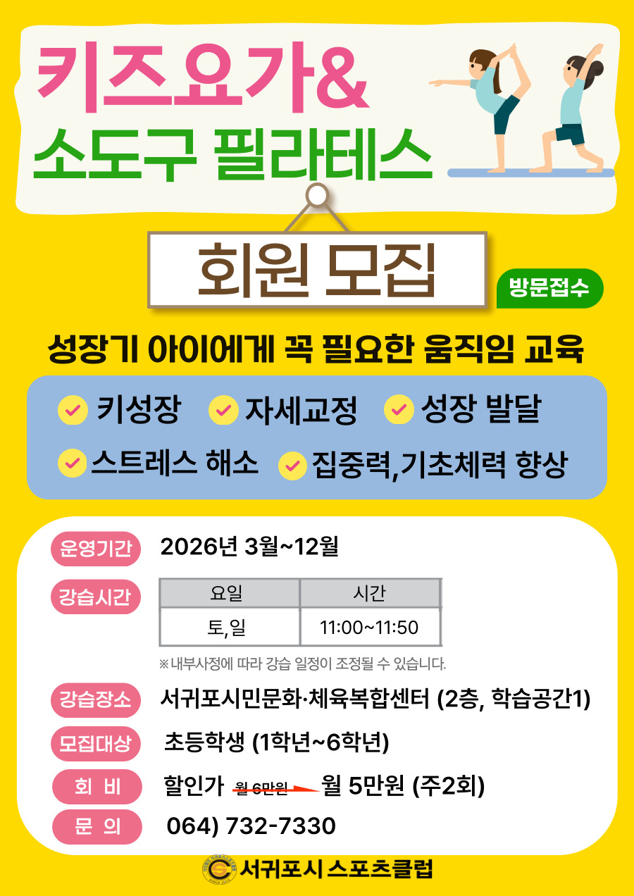 • 제목 2026 문화강좌 키즈요가(주말) 회원모집_ 서귀포시스포츠클럽