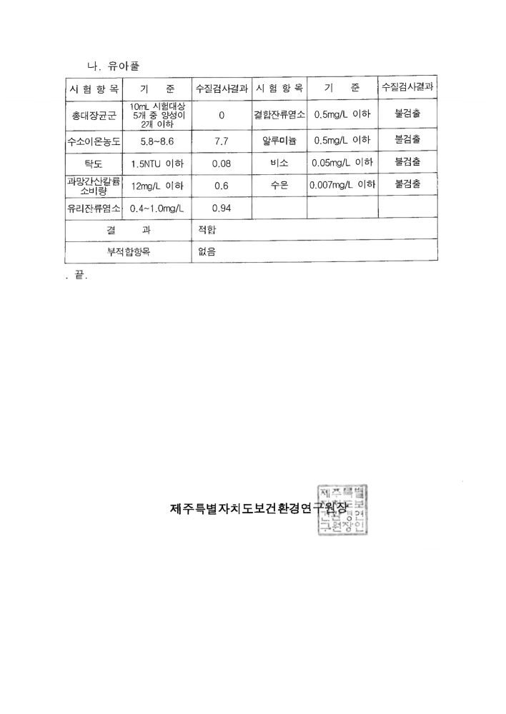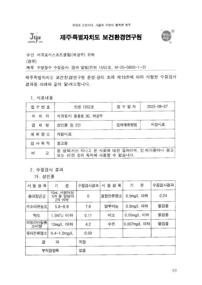 • 제목 2025년 서귀포시민문화체육복합센터 수영장수 수질검사 결과알림